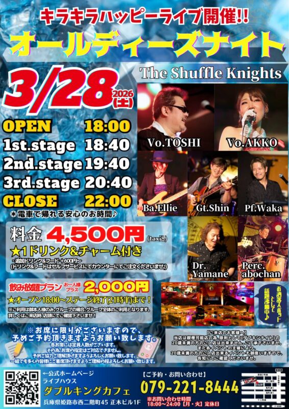 Vo:Toshi、Akko Gt: Shin Ba: Ellie Key: Waka Dr: Yamane Per: Abo-chan OPEN 18:00 1st Stage 18:40 2nd Stage 19:40 3rd Stage 20:40 Close 22:00 お一人様: 4,500円(1ドリンク・チャーム付) 追加ドリンク&フード:600円~(カウンターにてキャッシュオン) 飲み放題プラン:お一人様プラス2,000円(最終ステージ終了まで)
