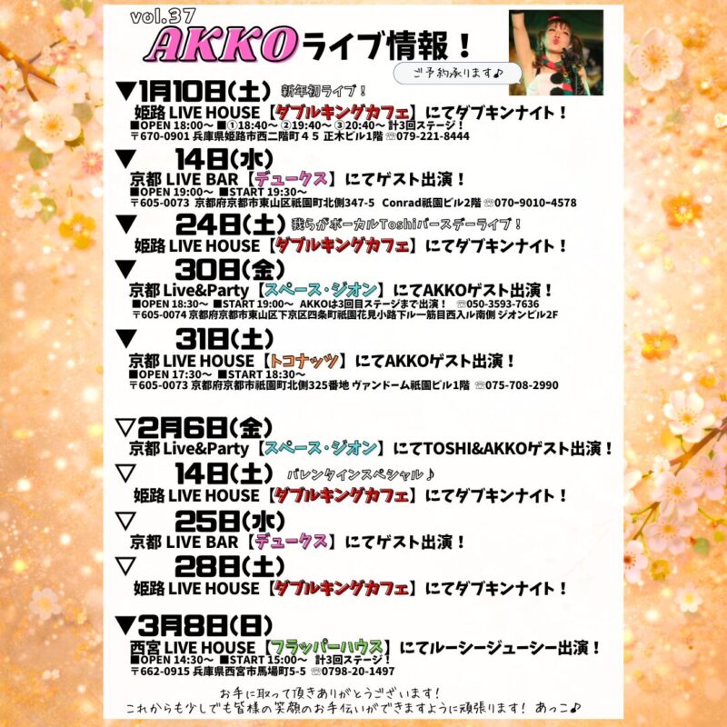 1月のAKKOライブスケジュール☃️